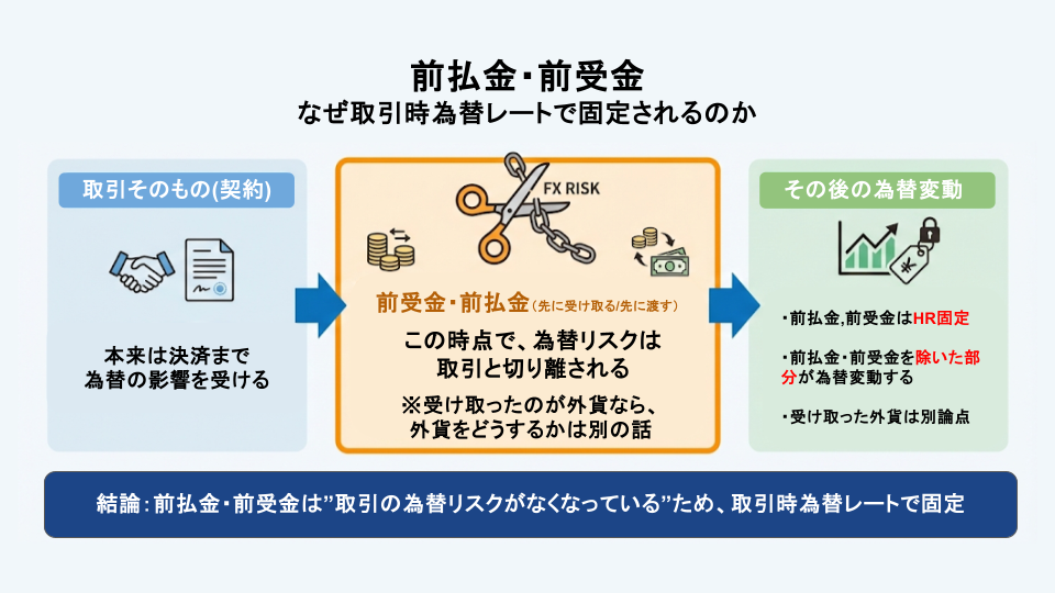 簿記の定番のつまずき所「前払金・前受金はなぜ換算替えしないのか(HR固定なのか)」。