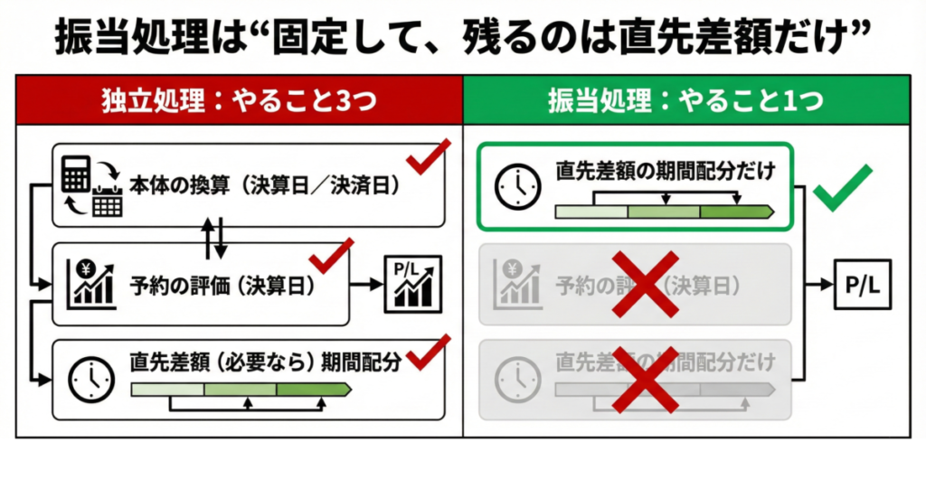 A.振当処理は「既存の債権債務のレートを書き換えて固定する」処理だからです。